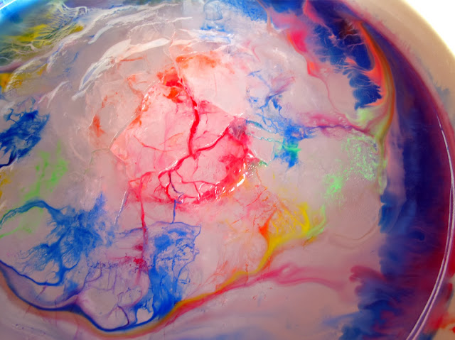 We are in the middle of a heat wave here and it is so so hot and today my son came up with a rather brilliant project that keeps you cool and occupied as well. It is a slight variation on yesterdays hot day activity called "ice bergs" where we used the same bowls of ice and skated plastic animals on them and then submerged them under it once it had melted enough... this one was slightly more interesting